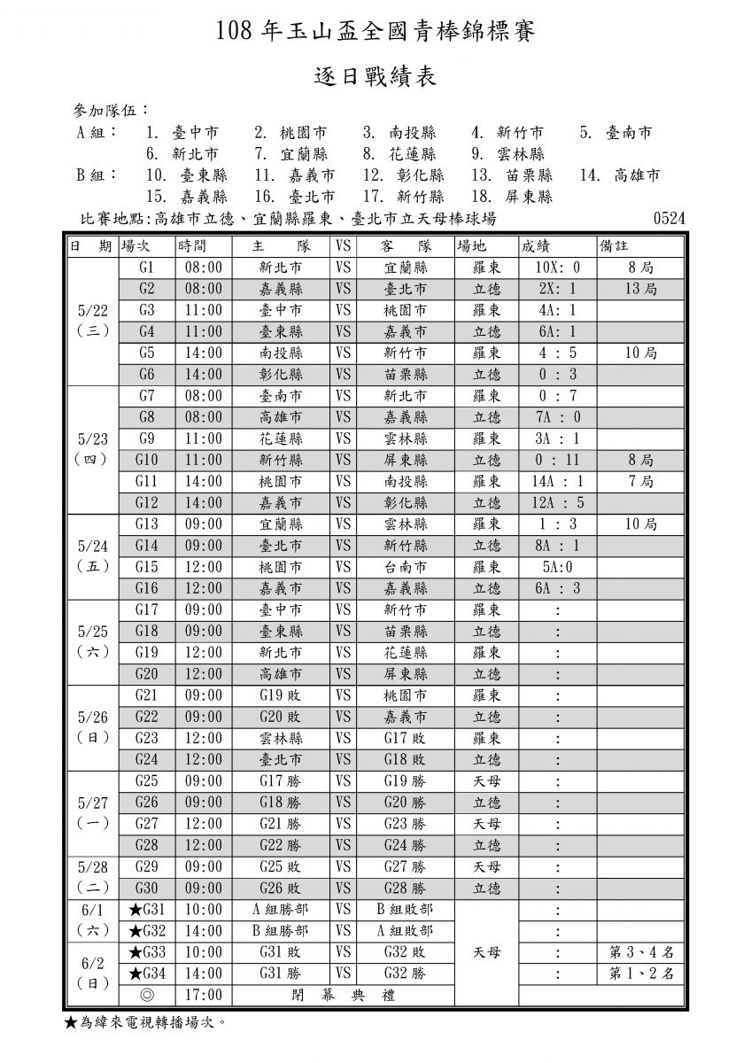 108年玉山盃逐日戰績表0524