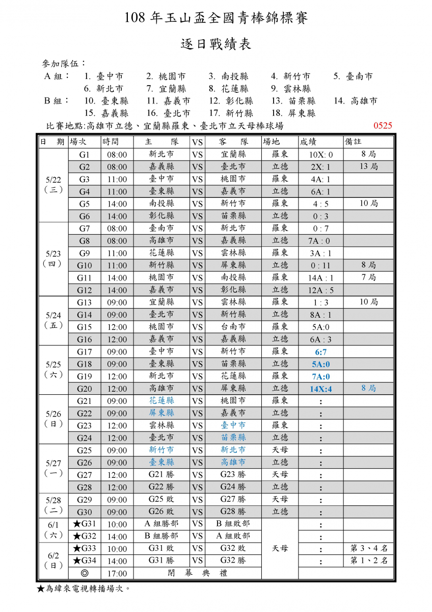 108年玉山盃逐日戰績表0525