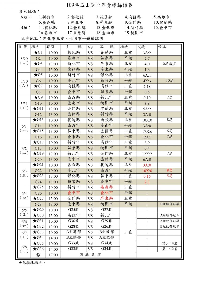 109年玉山盃逐日戰績表0603