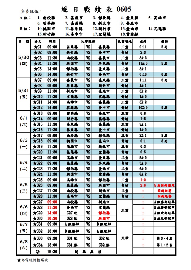6/05 逐日戰績表 G27, G28 改為6/06 於三重棒球場進行
