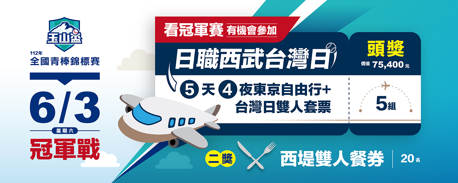 冠軍戰到天母棒球場,支持台灣青棒,或是收看玉山盃冠軍戰轉播,就有機會前進東京參加日職西武台灣日的大獎。