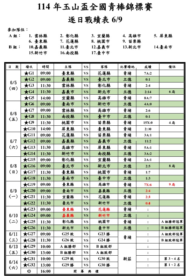 114年玉山盃全國青棒錦標賽 逐日戰績表 0609