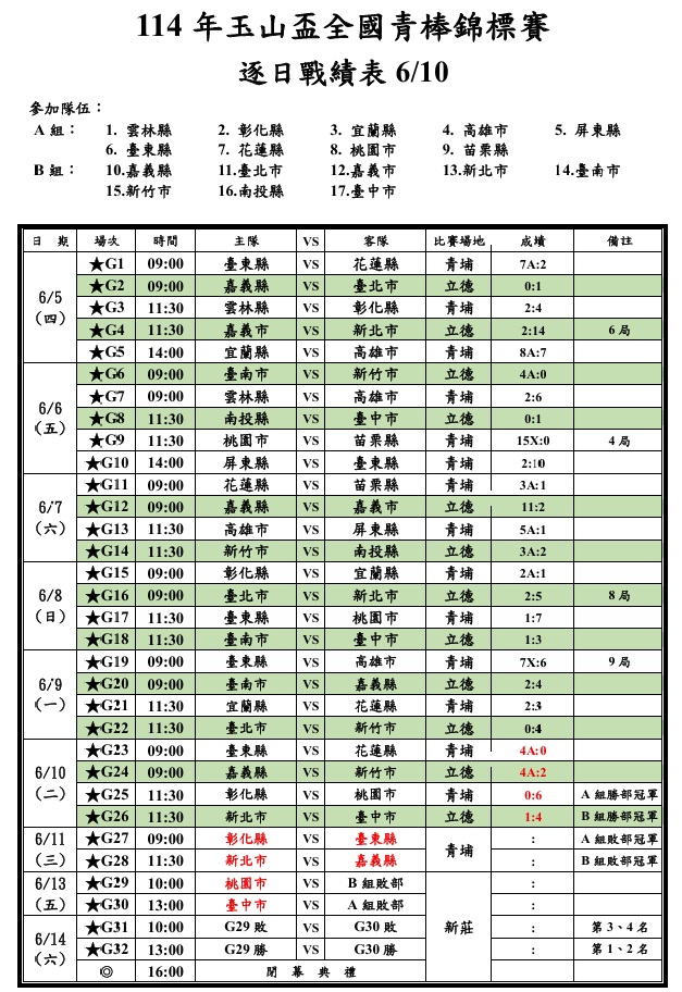 114年玉山盃全國青棒錦標賽 逐日戰績表 0610