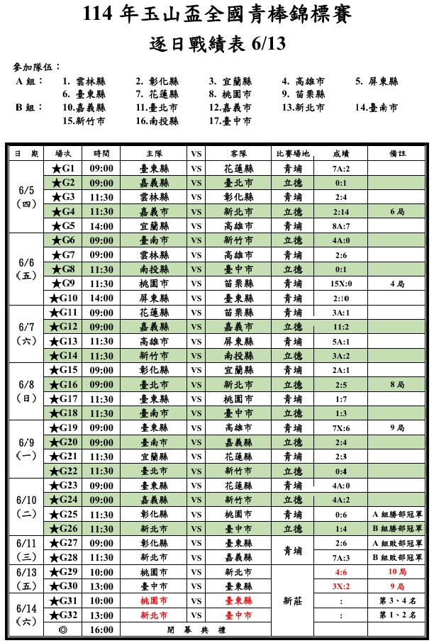 114年玉山盃全國青棒錦標賽 逐日戰績表 0613